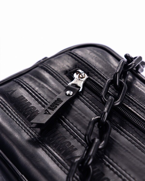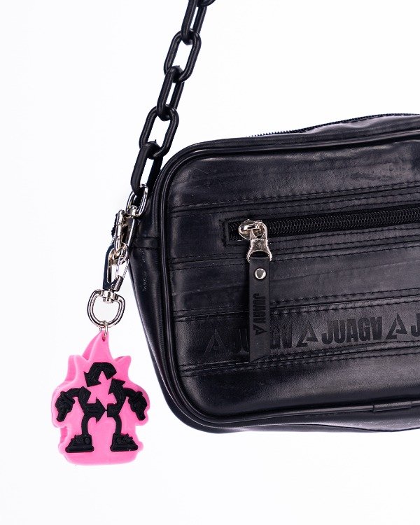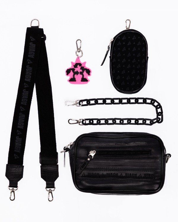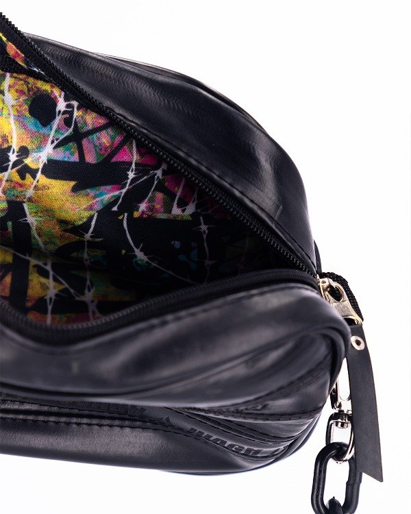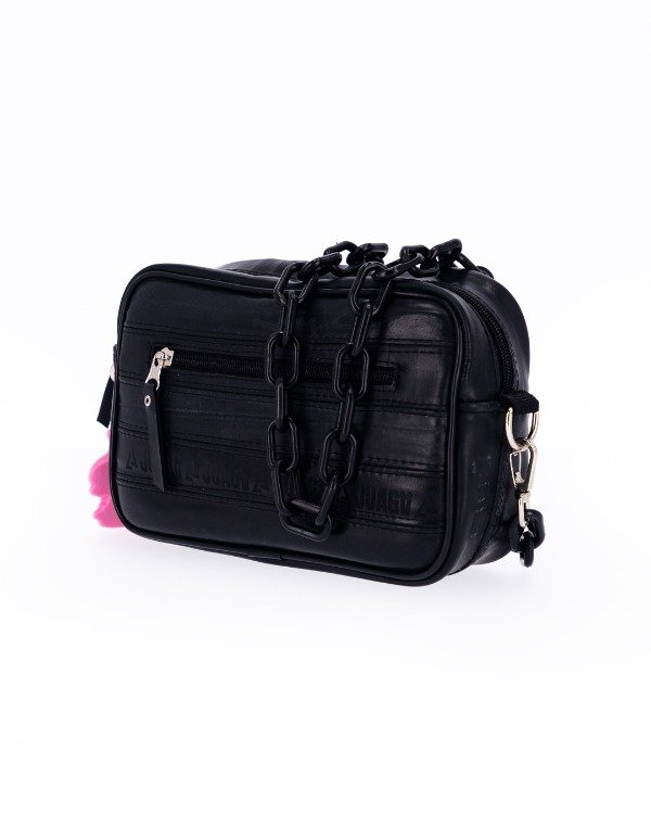 Cartera fabricada reutilizando caucho de rodados vehiculares desechados (cámaras de ruedas de bicicleta).