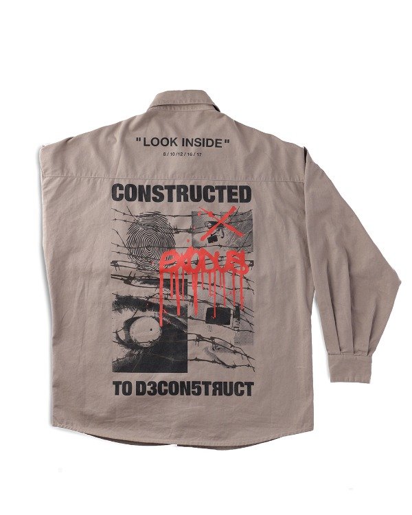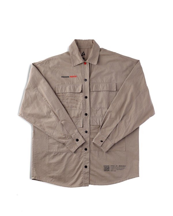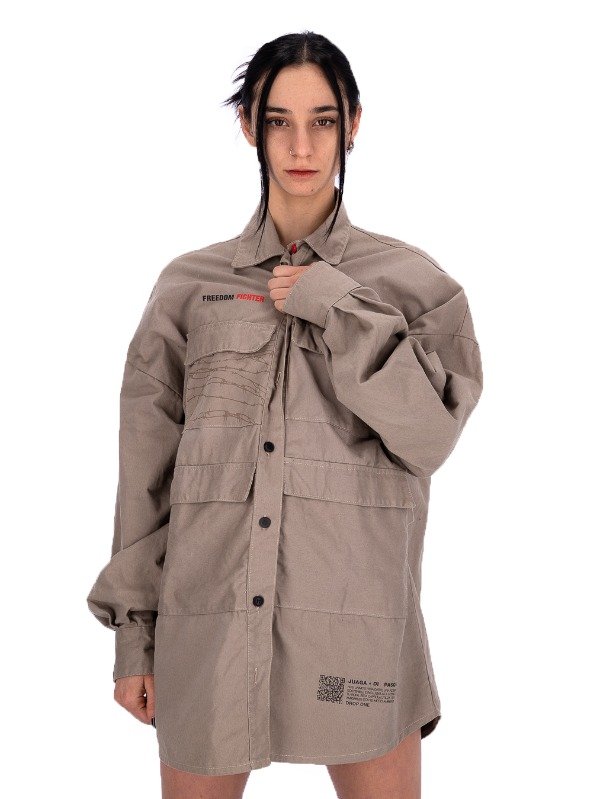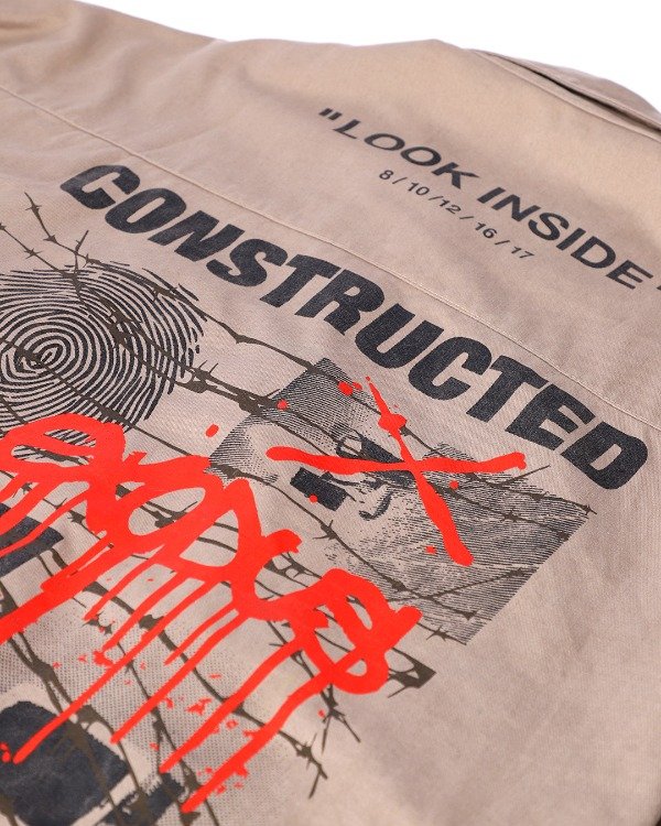 CHAQUETA OVERSIZE, manga larga. Cuatro bolsillos plaqué con tapa, serigrafía en frente y espalda.